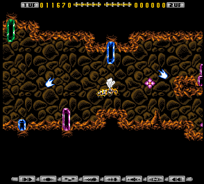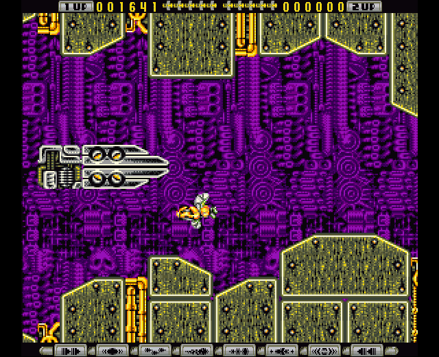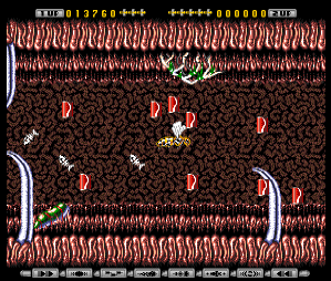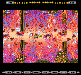 Eww. I'm still not sure if this is a bonus stage or not. It's not given a name. Anyway, if you destroy the maggots on the dead rat, you can fly into the rat's body. You end up flying through its still-heaving guts, accompanied by horrible sloshy sounds.