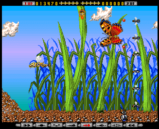 A relatively hectic bit of the level. Two lines of flies weave at you, moths are firing their triple spread shots, and a grasshopper leaps straight up into the middle of it all.