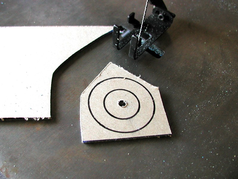 After marking the inner and outer circles, I drilled a hole in the center and mounted the piece on a 1/4" bolt, secured with a flange nut. The bolt is then secured in the chuck of a drill press, which is laying on its side. Very useful tool, the drill press. |