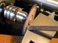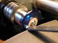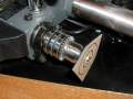 A small anvil makes a nice rest for a lathe tool, obtained from the Sears tool department. This one is a Parting tool, used to cut completely through the material. |