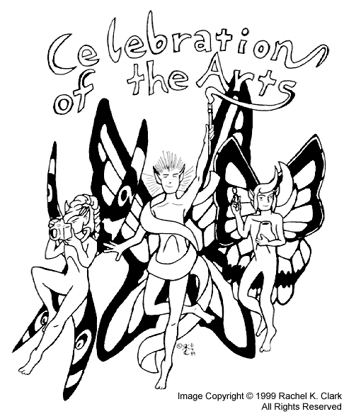 I used a pixie (as in fairfolk) theme because I supposed it held more mass appeal at my school than a "raptor" with a paintbrush would. It was a nice departure, anyway. I think they came out rather nice, especially the hands and feet, which tend to pose many difficulties to me. The characters represent the three main aspects of my school's art program: photography, painting, and sculpture. -- April 23, 2000
