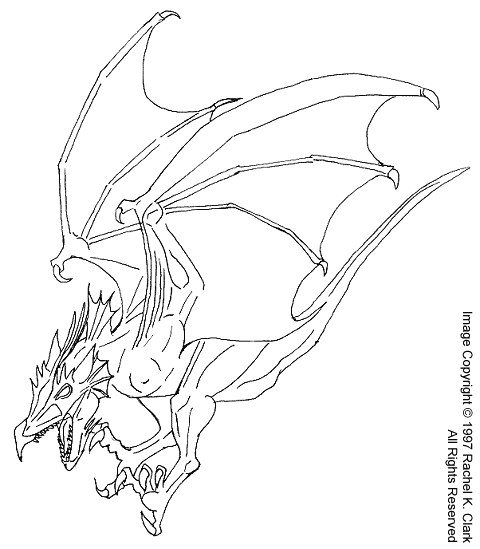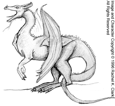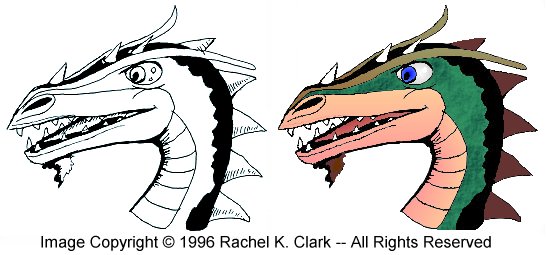 This handsome fellow is a main character in the Rankin-Bass animated film, "The Flight of Dragons." It's a little corny, but also rather funny and intellectual, making it well worth any dragon-lover's time. (Many of the characters were borrowed from Gordon Dickson's book "The Dragon and the George," including Gorbash.) He was one of the original graphics I prepared for TRS's debut; Gorbash (hope I'm spelling that right) has since been replaced by a hissing eagle on the main page, but you can still take a look in case you missed him. Keep in mind this was one of the first drawings I attempted to color on the computer.