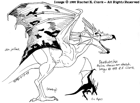 A character from an abandoned story of mine which originated in Dragon's Inn (the same as Bellatrix and Orion). Phoenix (creative name, eh?) is a gargoyle (like in the Disney cartoon) and can be considered Redlock's girlfriend. This drawing is actually quite nice, especially considering the date, and it shines in that it departs from lateral view (which was a pain for me to depart from back then). Unlike the female gargoyles of Disney's show, Phoenix is avian-draconoid rather than humanoid. -- April 23, 2000