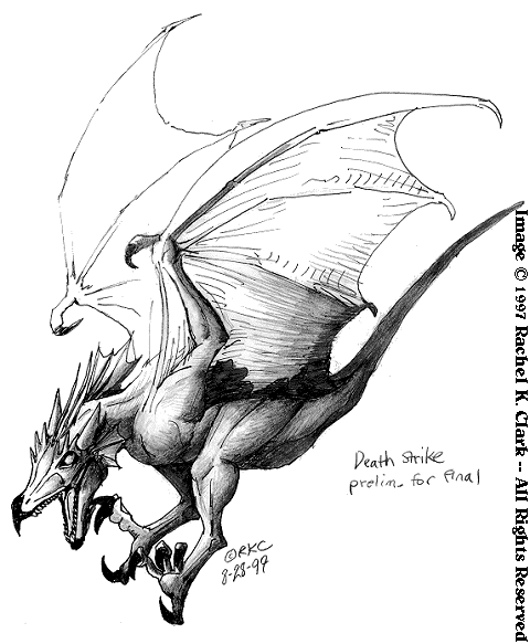 I can't remember the exact date on this one... An unusual drawing that somehow ended up on the cardboard back of one of my sketchbooks (not exactly archival material, but what the hey). This is one of my earlier stabs at a draconian gryphon, that is, a dragon that could be mistaken for an eagle-lion hybrid. I love using Pilot black ink pens, but the problem they pose became apparent when I scanned this one: The scanner, at least mine, picks up a reddish tint in the black ink, which means I have to manually darken the reddish ink in the scan to make it look like the original. -- April 24, 2000