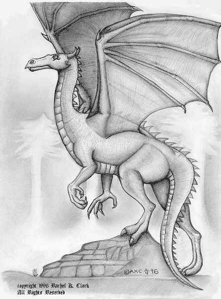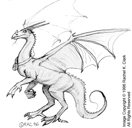 Both the dragon (Bellatrix) and the gargoyle (can't remember her name at the moment) were characters I concocted while I dabbled in a roleplaying newsgroup (Dragon's Inn or something like that). Some of the ideas are interesting enough that I might rehash them someday into something else. Until then, this drawing remains a fine example of middle school experimentation. Note the pointilistic approach to the background and the bold (for me at the time) lighting and shading. One of the challenges here was creating a sense of movement, Bellatrix right before she leaps into the air, which I think I succeeded with, at least with the legs (the wings seem a bit awkward to me). -- April 23, 2000
