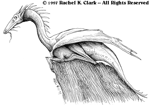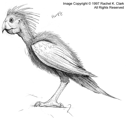 I'm not big on cryptozoological hybrids, especially ones that splice two completely unrelated animals -- in the harpy's case, old hag and foul vulture. Just for fun, I tried to draw an animal that might be mistaken for such a hybrid, but is really just a strange-looking bird. I recently drew another concept of a harpy, similar to this one except much uglier, with a distended crop that could be interpreted as a breast, which harpies supposedly had. -- April 24, 2000