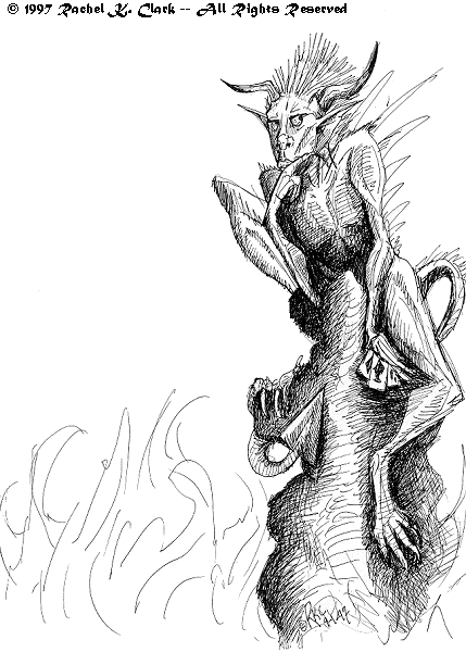 This character is the brother of Bellatrix above. There was a reason for the lack of familial resemblance, but I was writing that stuff so long ago, I can't really remember. Some aspects of this drawing seem remarkably modern, but it's still very 1996-RKC. -- April 23, 2000