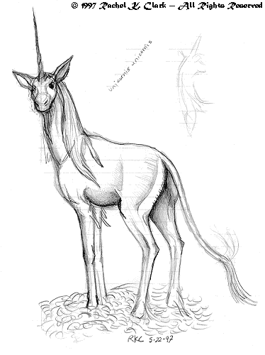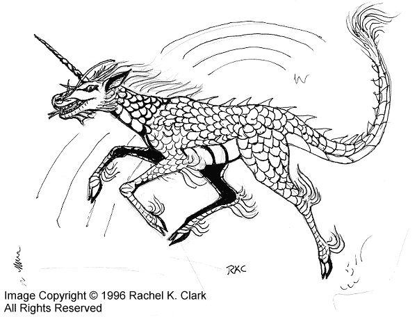 I drew this during spare time in art class, probably as my eighth grade year neared its end. No one in class seemed to appreciate my Oriental unicorn too much, but I'm still quite fond of this drawing, especially the legs and some of the scales. The lines in the background are supposed to suggest a rainbow. -- April 24, 2000