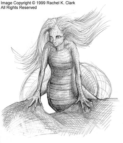 My interpretation of a human-serpent hybrid. I still like the arms and hands on her, but, if I redrew this, I'd probably ditch the hair and make the post-pelvic area considerably more slender. -- April 24, 2000