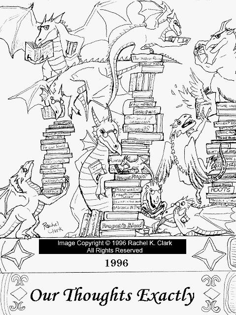 This was my primary contribution to my middle school, my farewell present before my eighth grade year ended. Our Thoughts Exactly is an annual literature/art publication of my middle school (whose identity has been erased from the scan you can view). I contributed a lot of artwork, a story (Tabrian and Redlock! yeah!), and, of course, the cover to 1996's edition. The dragon theme reflects my obsession at the time, and the influence from my daily viewing of "Gargoyles" is rather apparent. The arms on the dragon holding the stack of books continues to bother me, but that's beside the point. -- April 23, 2000